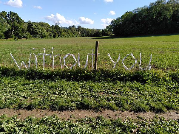 'Dear Earth' (1x14m) is a site specific, text-based installation made with sections of bed sheets knotted onto a wire fence which forms a field boundary on the Dartington Estate. It was installed and deinstalled on 24th May 2022 and was informed by the graffiti found in the Temple in the formal garden, which reads 'Dear Earth, I couldn't live without you'.