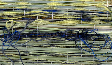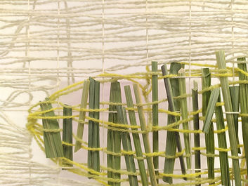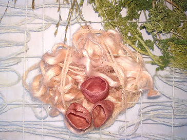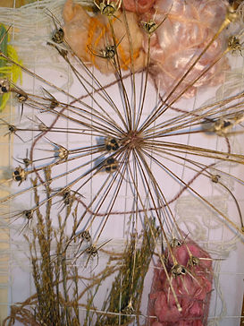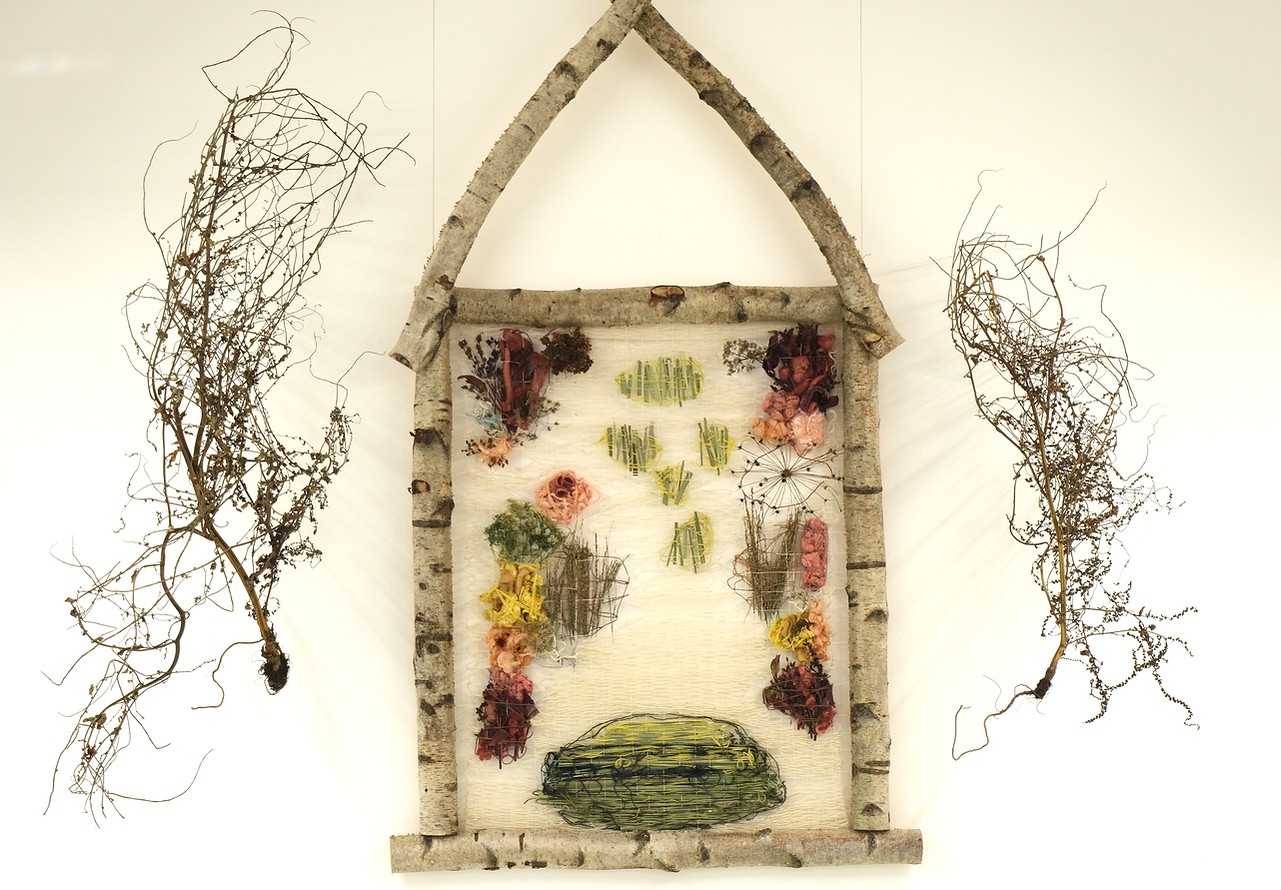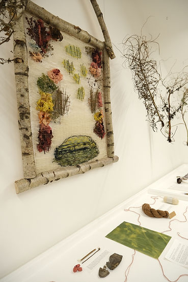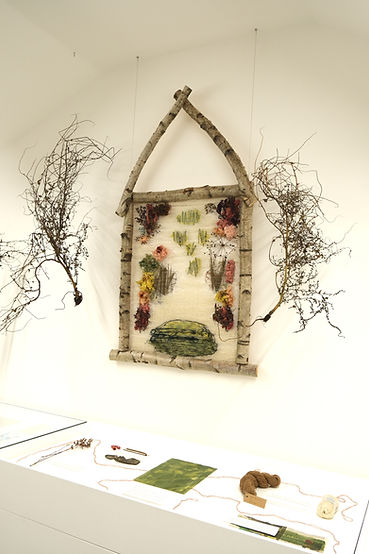 Presented as an installation (5x2x0.5m), the work comprised of a central woven panel (silver birch frame, plant-dyed Somerset wool, plant material, silk cocoons) and suspended 'trees' (plants from the Oudolf Field garden compost heap). The frame and weaving referenced the shape of the original threshing barn (now the main gallery space) on the site and the planting design by Piet Oudolf for the gallery garden (the Oudolf Field).