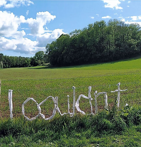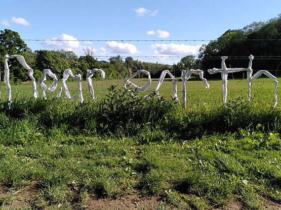 'Dear Earth' (1x14m) is a site specific, text-based installation made with sections of bed sheets knotted onto a wire fence which forms a field boundary on the Dartington Estate. It was installed and deinstalled on 24th May 2022 and was informed by the graffiti found in the Temple in the formal garden, which reads 'Dear Earth, I couldn't live without you'.