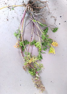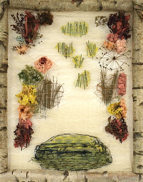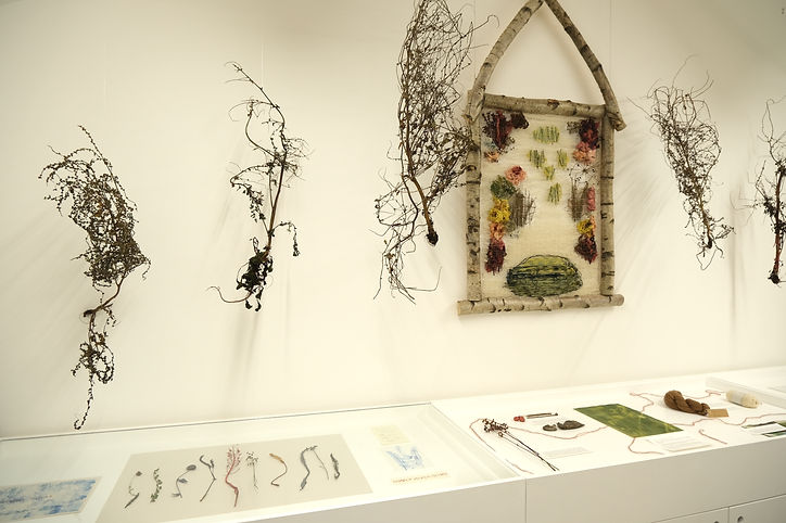 Presented as an installation (5x2x0.5m), the work comprised of a central woven panel (silver birch frame, plant-dyed Somerset wool, plant material, silk cocoons) and suspended 'trees' (plants from the Oudolf Field garden compost heap). The frame and weaving referenced the shape of the original threshing barn (now the main gallery space) on the site and the planting design by Piet Oudolf for the gallery garden (the Oudolf Field).