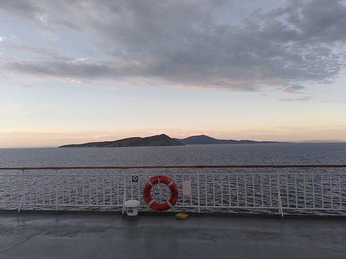 But where, in these days of planetary level problems and climatic-scale crisis, are we crossing over to? Black smoke rises from the south from forest fires raging along the coast of Albania as we sail along. How long before fires rage to the north of us too? Only a few days as it turns out, as the heatwave follows the ferry northwards across the seas. The space between here and there reduces ever more quickly. When will we realise that we are leaving ourselves with nowhere to go?